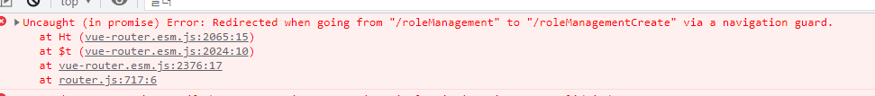 위의 오류에서 /roleManagement 에서 /roleManagementCreate로 이동할 때 같은 레벨로 이동하는 것이 아니라 /roleManagement/create로 이동하도록 path를 수정해주니 정상적으로 작동하였다. 이 경우가 아닐 경우 router.push.catch()와 같이 뒤에 catch문을 넣어주면 정상적으로 작동한다는 이야기도 있다. 추후에 다른 원인들도 추가로 업데이트할 예정이다.